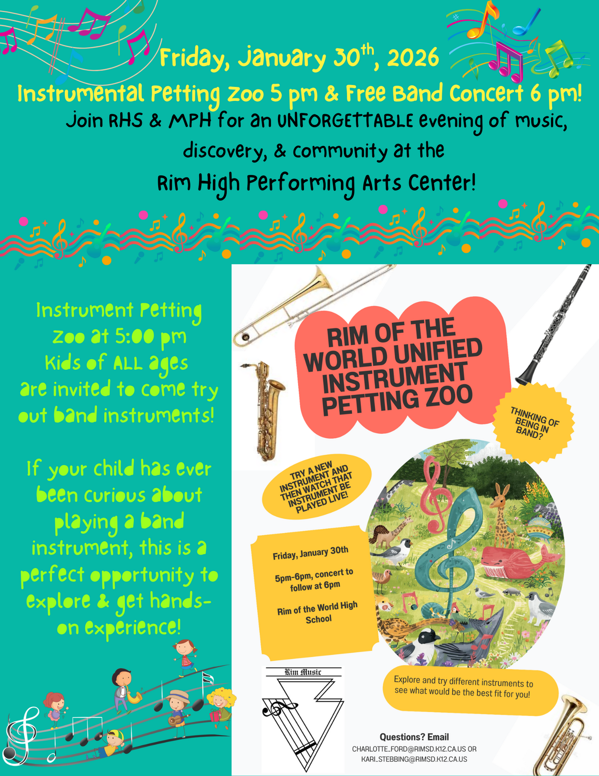 If your child has ever been curious about playing a band instrument, this is a perfect opportunity to explore & get hands-on experience! Rim of the World Unified Instrument Petting Zoo-Try a new instrument and then watch that instrument be played live! Thinking of beginning band? Friday, January 30th, 5 pm-6 pm-followed at 6 pm concert at 6 pm. at RHS. Explore and try different instruments to determine which is best for you. Questions? Email: Charlotte_Ford@rimsd.k12.ca.ue or Kari_Stebbing@rimsd.k12.ca.us