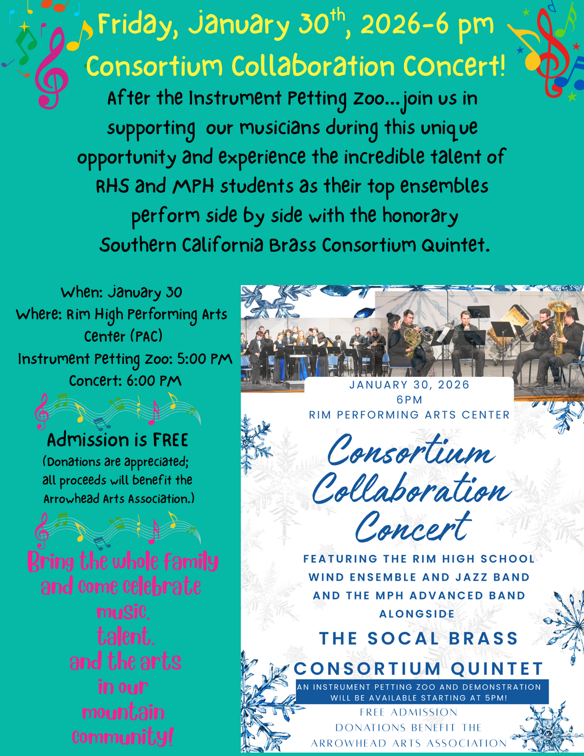 Consortium Collaboration Concert! After the Instrument Petting Zoo... join us in supporting our musicians during this unique opportunity and experience the incredible talent of RHS and MPH students as their top ensembles perform side by side with the honorary Southern California Brass Consortium Quintet. When: January 30