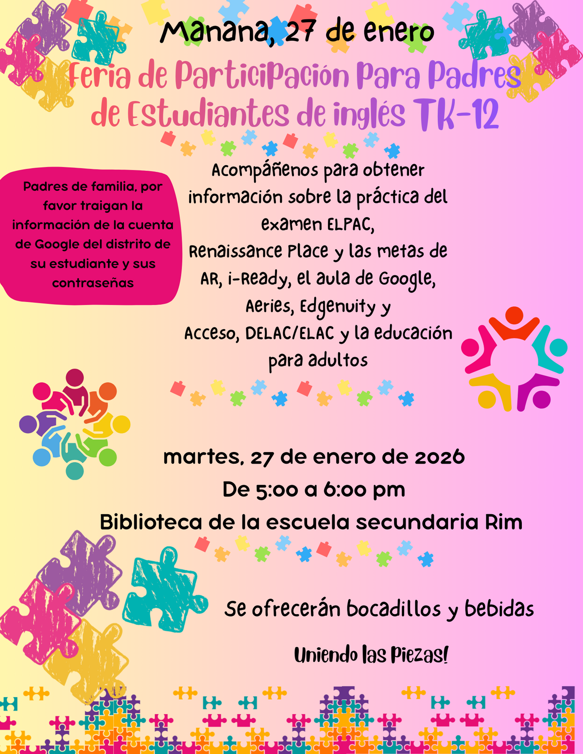 Página: Mañana, 27 de enero. Feria de Participación para Padres de Estudiantes de inglés TK-12. Acompáñenos para obtener información sobre la práctica del examen ELPAC, Renaissance Place y las metas de AR, i-Ready, el aula de Google, Aeries, Edgenuity y Acceso, DELAC/ELAC y la educación para adultos. martes, 27 de enero de 2026, de 5:00 a 6:00 pm, Biblioteca de la escuela secundaria Rim. Se ofrecerán bocadillos y bebidas. ¡Uniendo las piezas!¡ Uniendo las piezas!