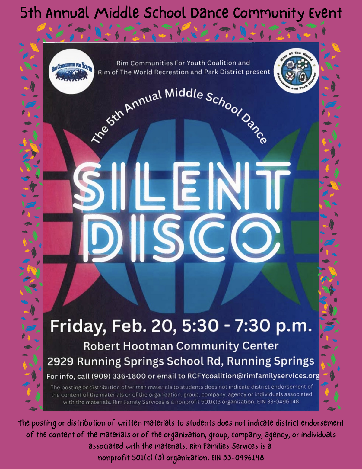 Page: Rim Communities for Youth Coalition and Rim of the World Recreation and Park District present the 5th Annual Middle School Dance. "Silent Disco" Friday, Feb. 20th, 2026, from 5:30 pm to 7:30 pm. at the Robert Hootman Community Center. 2929 Running Springs School Rd. For infor call 909-336-1800 or email to RCYFcoalition@rimfamilyservices.org