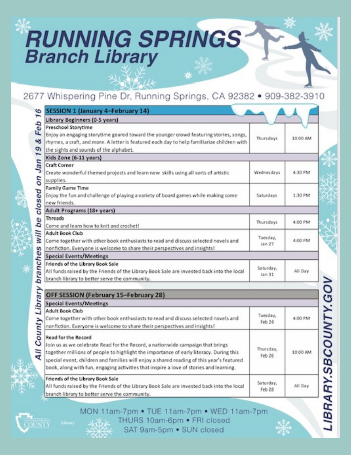 Page: Running Springs Branch Library: 2677 Whispering Pine Dr. Running Springs, CA 92383-(909) 382-3910