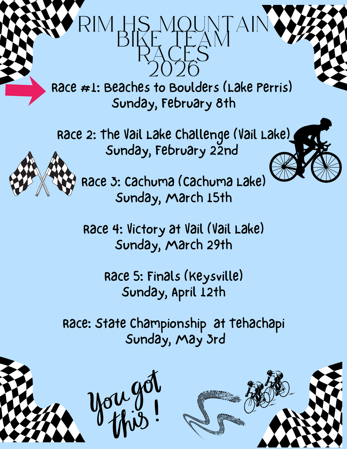 Page: RIM HS MOUNTAIN BIKE TEAM RACES 2026. Race #1: Beaches to Boulders (Lake Perris) Sunday, February 8th