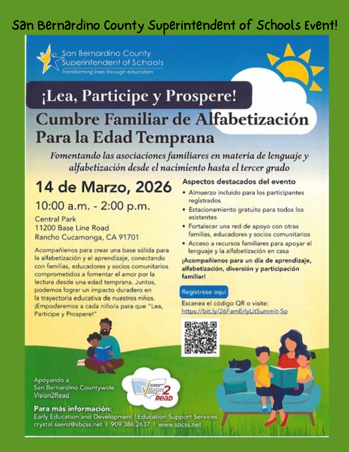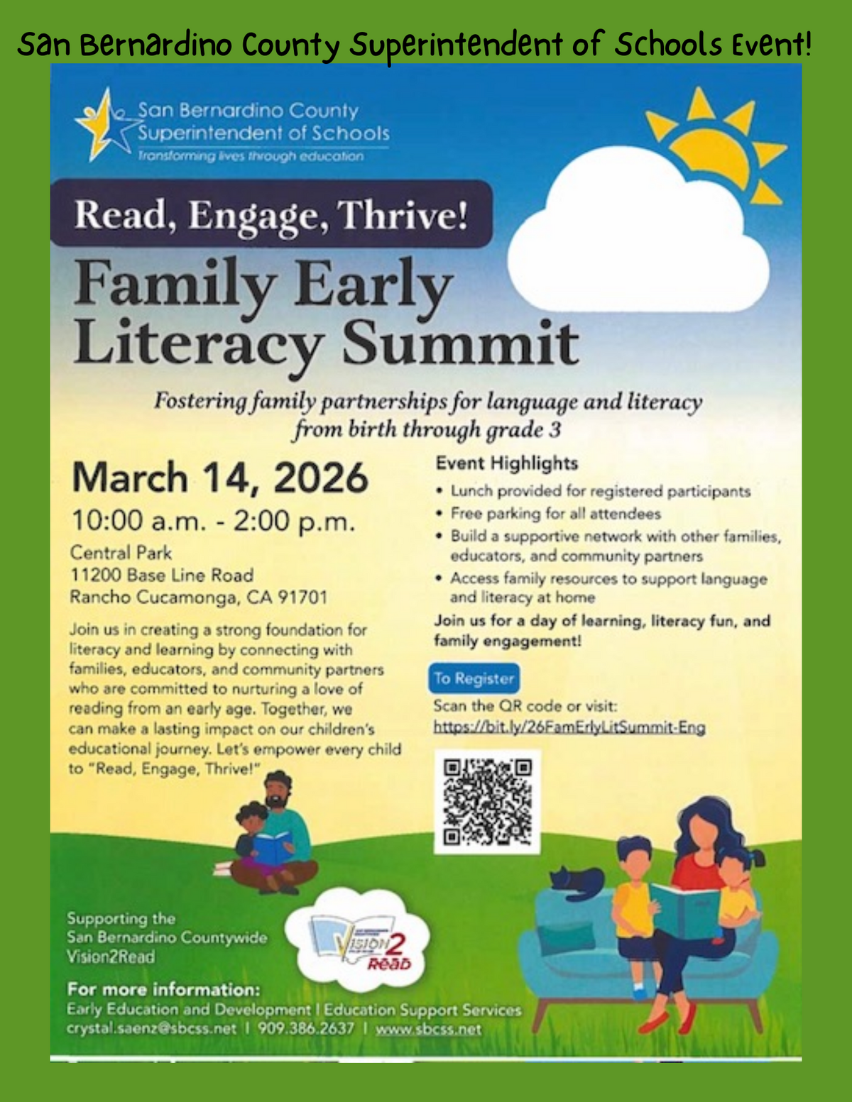 Page English/Spanish: San Bernardino County Superintendent of Schools Event! Read, Engage, Thrive! Family Early Literacy Summit. Fostering family partnerships for language and literacy from birth through grade 3. March 14th, 2026. 10 am to 2 pm. Central Park 11200 Base Line Road, Rancho Cucamonga, CA 91701. Join us in creating a strong foundation for literacy and learning by connecting with families, educators, and community partners who are committed to nurturing a love of reading from an early age. Together, we can make a lasting impact onour children's educational journey. Let's empower every child to Read, Engage, Thrive! Event Highlights: 1) Lunch provided for registered participants, 2) Free parking for all attendees, 3) Build a supportive network with other families, educators, and community partners, 4) Access family resources to support language and literacy at home. Join us for a day of learning, literacy fun, and family engagement. For more information: Early Education and Development Education Support Services. crystal.saenz@sbcss.net Phone: 909-386-2637 www.sbcss.net