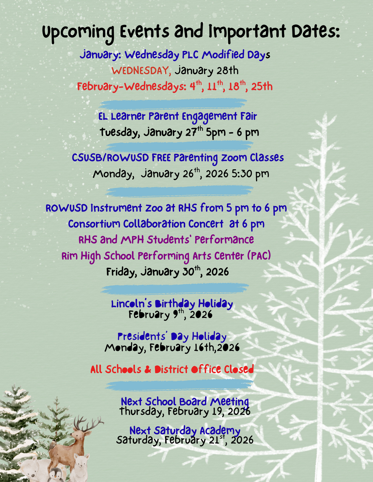Page: Upcoming Events and Important Dates: January: Wednesday PLC Modified Days WEDNESDAY, January 28th February-Wednesdays: 4th, 11th, 18th, 25th. EL Learner Parent Engagement Fair Tuesday, January 27th, 5 pm - 6 pm. CSUSB/ROWUSD FREE Parenting Zoom Classes Monday, January 26th, 2026, 5:30 pm. CSUSB/ROWUSD FREE Parenting Zoom Classes, Monday, January 26th, 2026, 5:30 pm. Lincoln’s Birthday Holiday, February 9th, 2026, and Presidents’ Day Holiday Monday, February 16th,2026. All Schools & District Office Closed. Next School Board Meeting: Thursday, February 19, 2026. Next Saturday, Academy Saturday, February 21st, 2026.