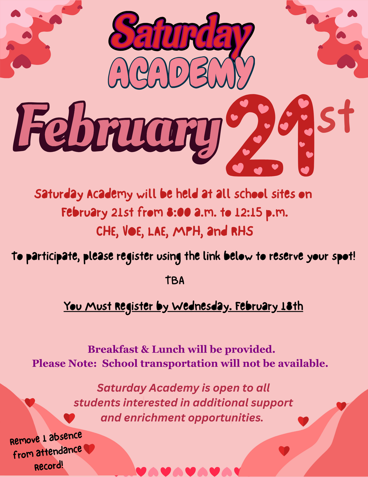 Page: Saturday Academy will be held at all school sites on February 21st from 8:00 a.m. to 12:15 p.m. at CHE, VOE, LAE, MPH, and RHS. To participate, please register using the link below to reserve your spot! You Must Register by Wednesday. February 18th. Breakfast & Lunch will be provided. Please note: School transportation will not be available. Saturday Academy is open to all students interested in additional support and enrichment opportunities. Remove 1 absence from the attendance Record!