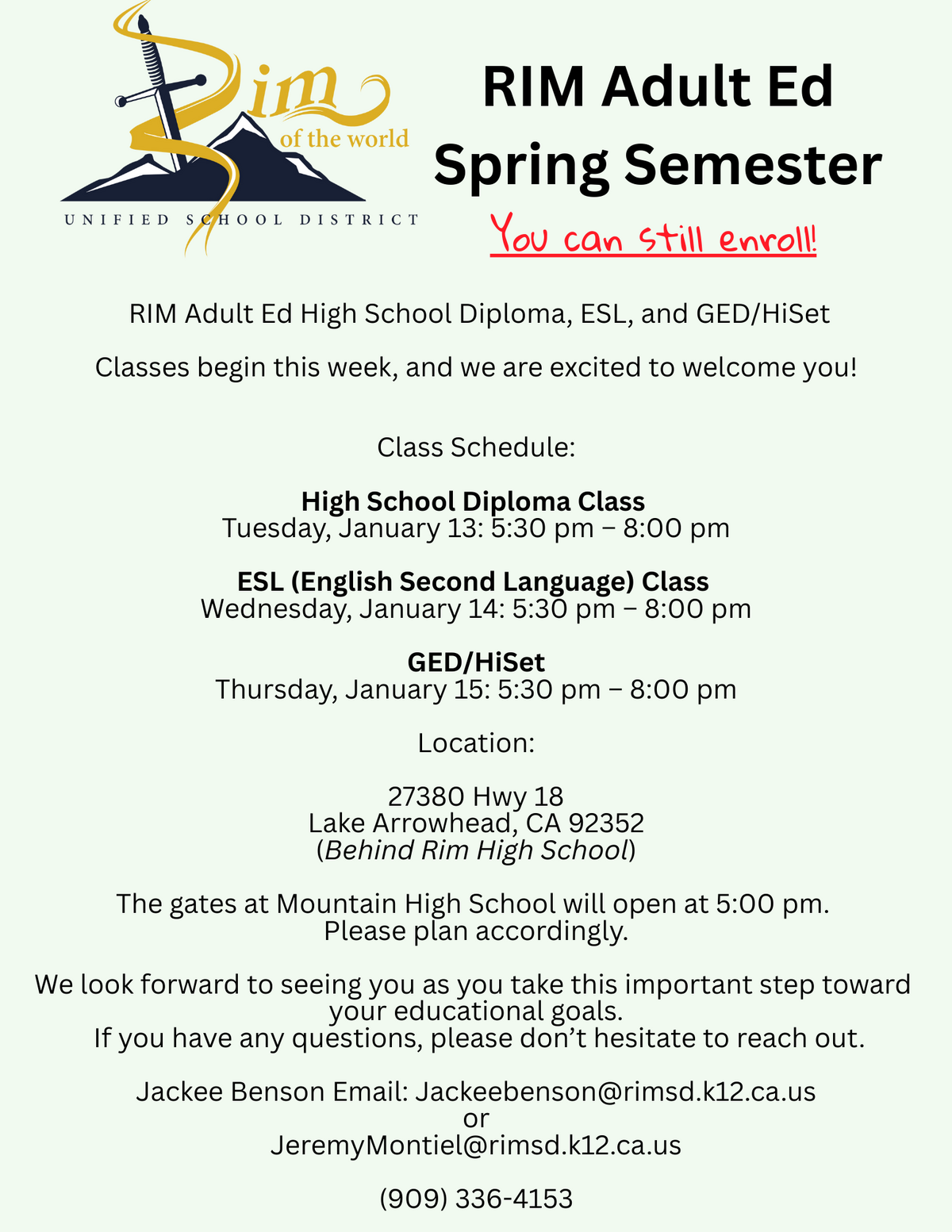 Jackee Benson Email: Jackeebenson@rimsd.k12.ca.us or JeremyMontiel@rimsd.k12.ca.us (909) 336-4153