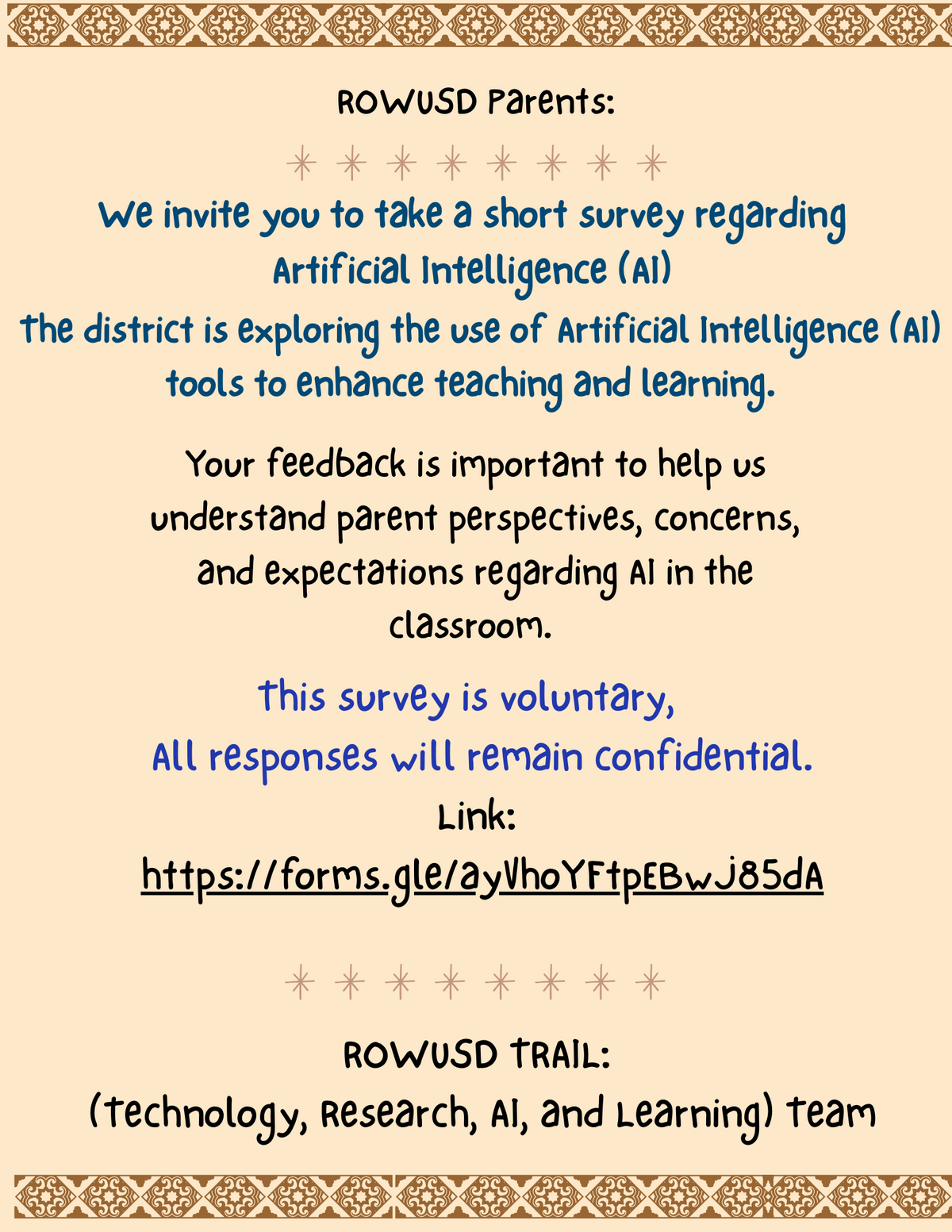 Page: ROWUSD Parents: We invite you to take a short survey regarding Artificial Intelligence (AI). The district is exploring the use of Artificial Intelligence (AI) tools to enhance teaching and learning. Your feedback is important to help us understand parent perspectives, concerns, and expectations regarding AI in the classroom.