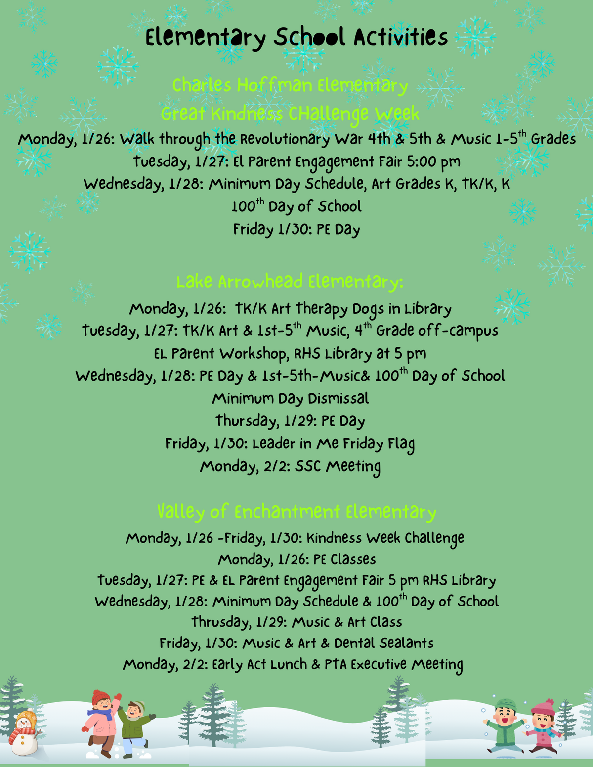 Page: Elementary School Activities. Charles Hoffman Elementary Great Kindness CHallenge Week. Monday, 1/26: Walk through the Revolutionary War 4th & 5th & Music 1-5th Grades Tuesday, 1/27: El Parent Engagement Fair 5:00 pm Wednesday, 1/28: Minimum Day Schedule, Art Grades K, TK/K, K 100th Day of School Friday 1/30: PE Day.