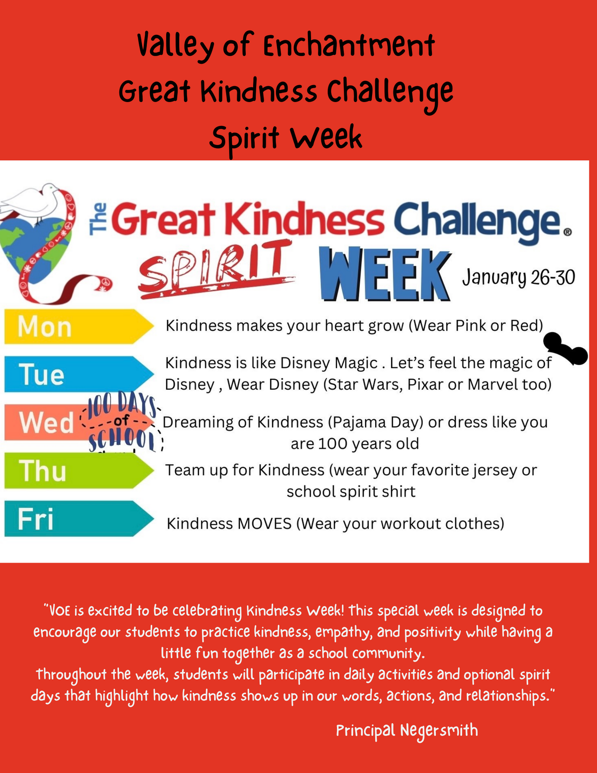 Throughout the week, students will participate in daily activities and optional spirit days that highlight how kindness shows up in our words, actions, and relationships.” Principal Negersmith. The Great Kindness Challenge Spirit Week. January 26-30. Monday-Kindness makes your heart grow (wear pink or red)./ Tuesday-Kindness is like Disney Magic. Let's feel the magic of Disney, Wear Disney (Star Wars, Pixar, and Marvel too)./ Wednesday 100 days of school!-Dreaming of Kindness (Pajama Day) or dress like you are 100 years old./ Thursday-Team up for Kindness (wear your favorite jersey or school spirit shirt)./Friday MOVES (wear your workout clothes).
