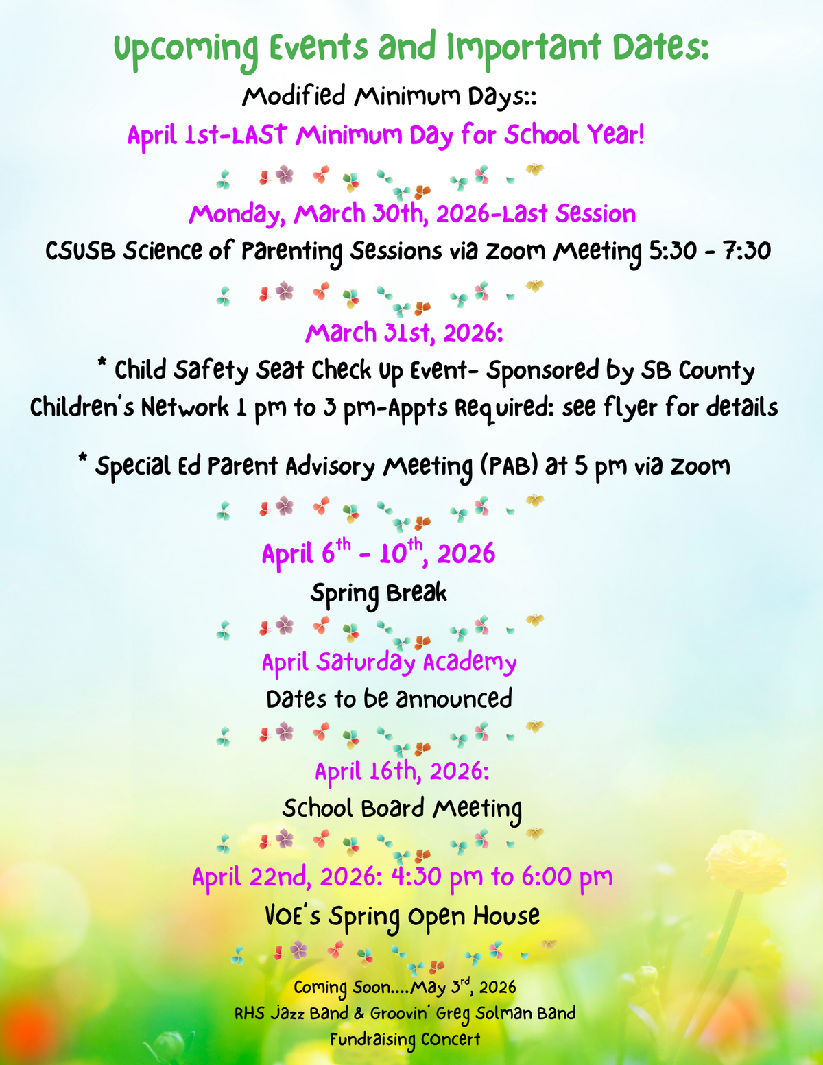 Page: Upcoming Events and Important Dates: Modified Minimum Days: April 1st-LAST Minimum Day for School Year! Monday, March 30th, 2026-Last Session