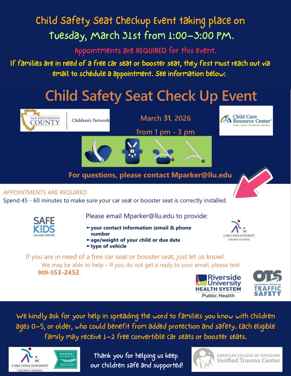 Child Safety Seat Check Up Event on March 31 st, 2026, from 1 pm to 3 pm. For questions, please contact Mparker@llu.edu
