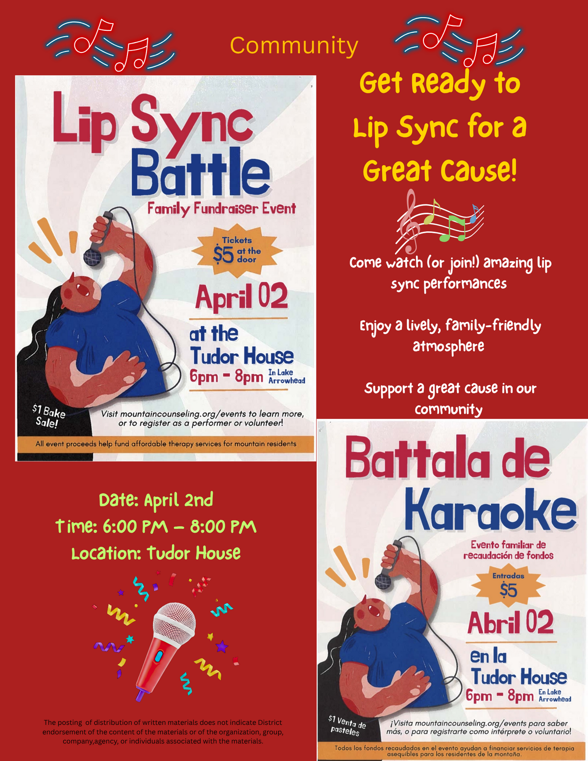 Support a great cause in our community. Date: April 2nd, Time: 6:00 PM – 8:00 PM, Location: Tudor House. Lip Sync Family Fundraiser Event. Tickets are $5 at the door. April 2nd, 2026, located at the Tudor House from 6 pm to 8 pm in Lake Arrowhead. The posting or distribution of written materials does not indicate District endorsement of the content of the materials or of the organization, group, company, or individuals associated with the materials.