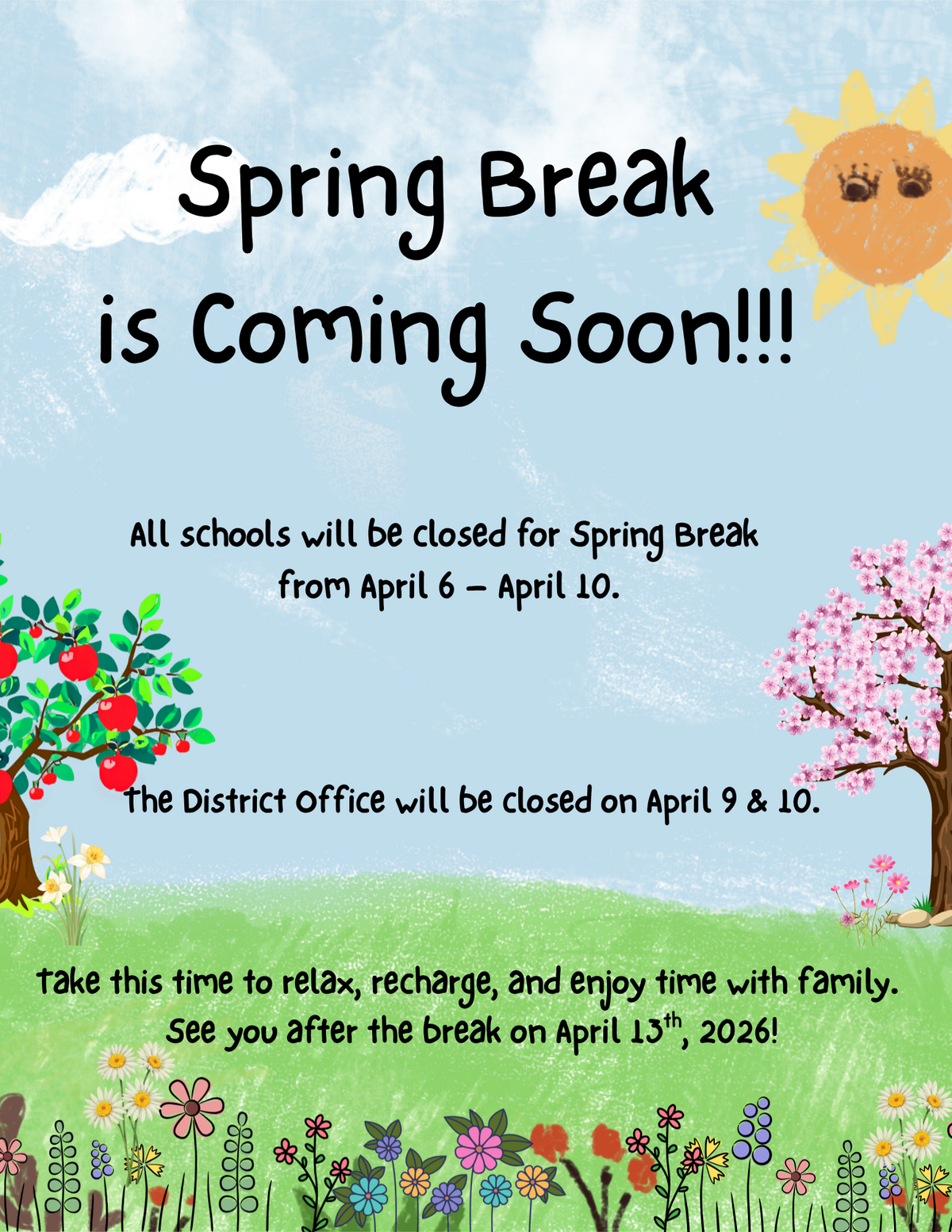 Page: Spring Break is Coming Soon!!! All schools will be closed for Spring Break from April 6 – April 10. The District Office will be closed on April 9 & 10. Take this time to relax, recharge, and enjoy time with family. See you after the break on April 13th, 2026!