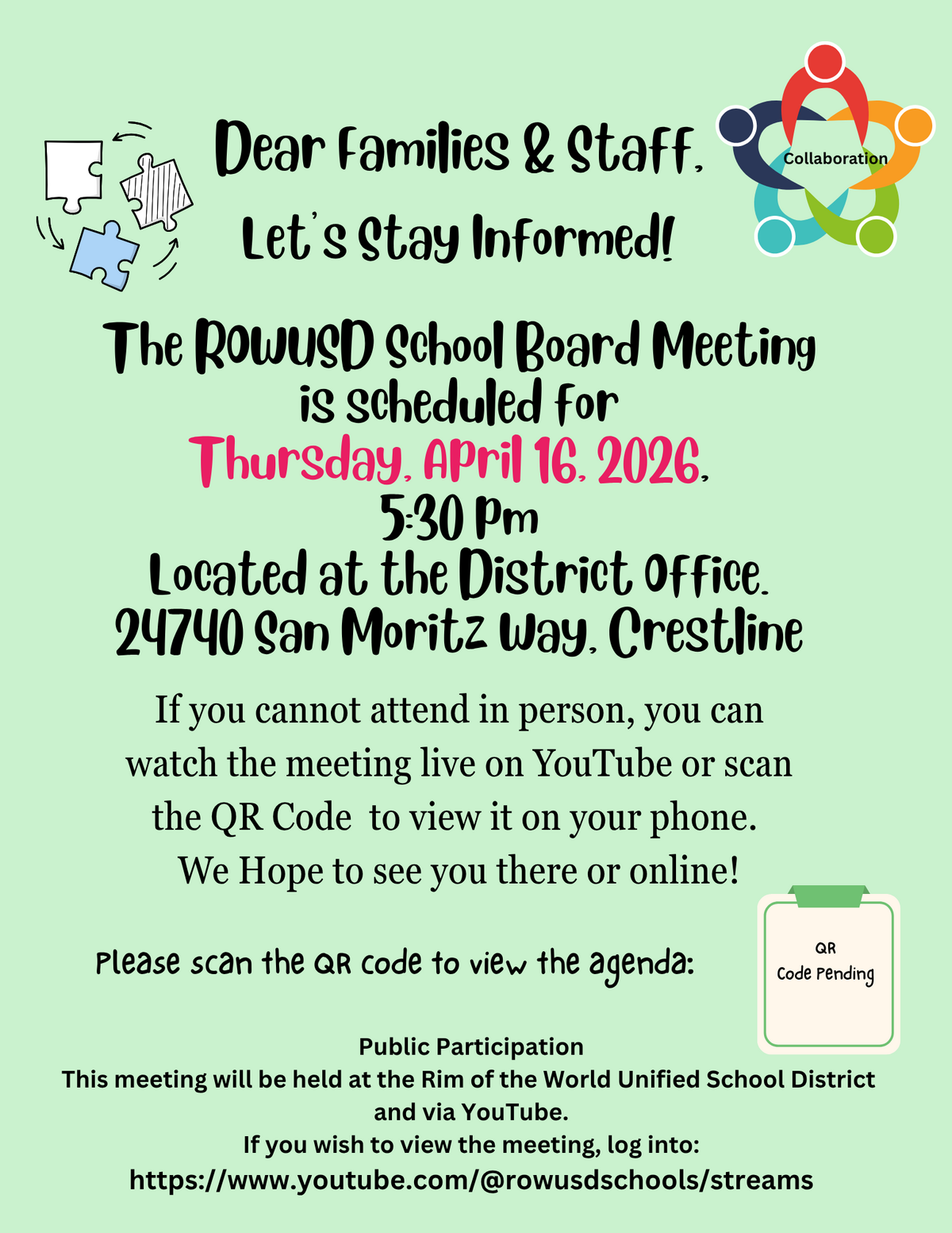 Page: Dear Families & Staff, Let’s Stay Informed! The ROWUSD School Board Meeting is scheduled for Thursday, April 16, 2026, at 5:30 pm, located at the District Office.24740 San Moritz Way, Crestline. If you cannot attend in person, you can watch the meeting live on YouTube or scan the QR Code to view it on your phone.