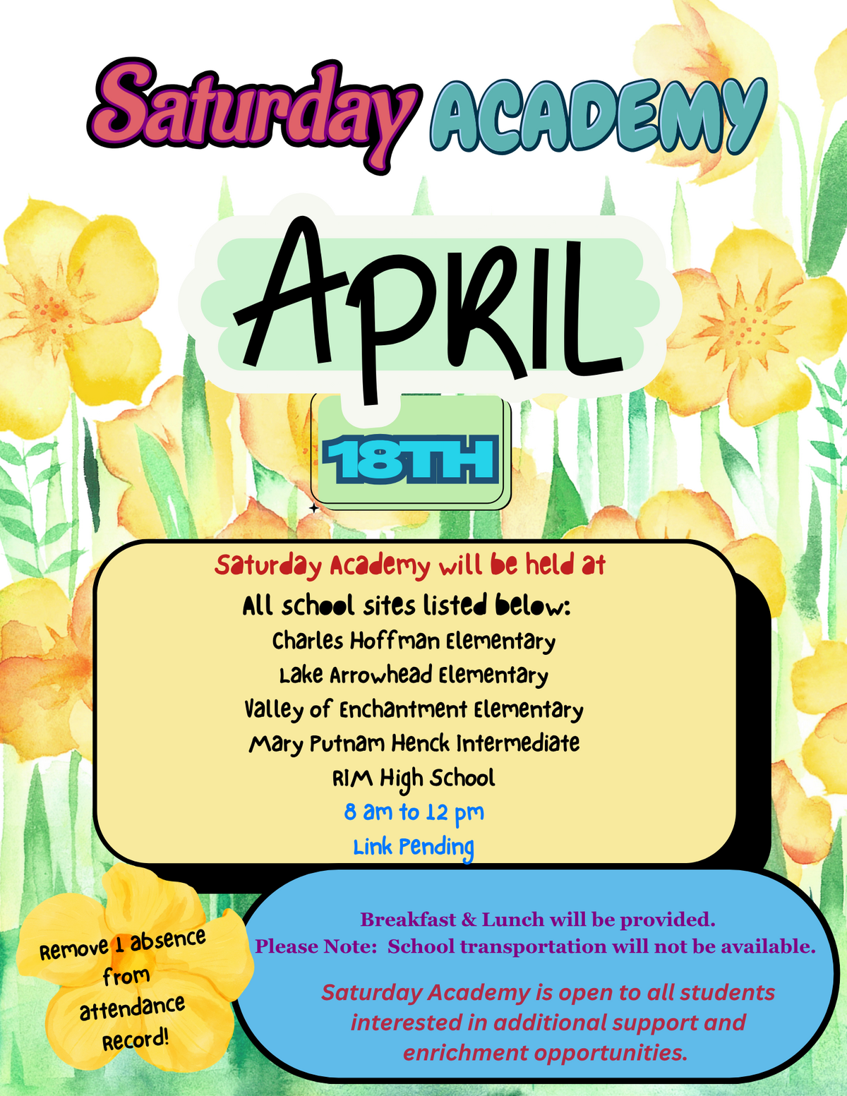 Please note: School transportation will not be available. Saturday Academy is open to all students interested in additional support and enrichment opportunities. Remove 1 absence from the attendance Record!