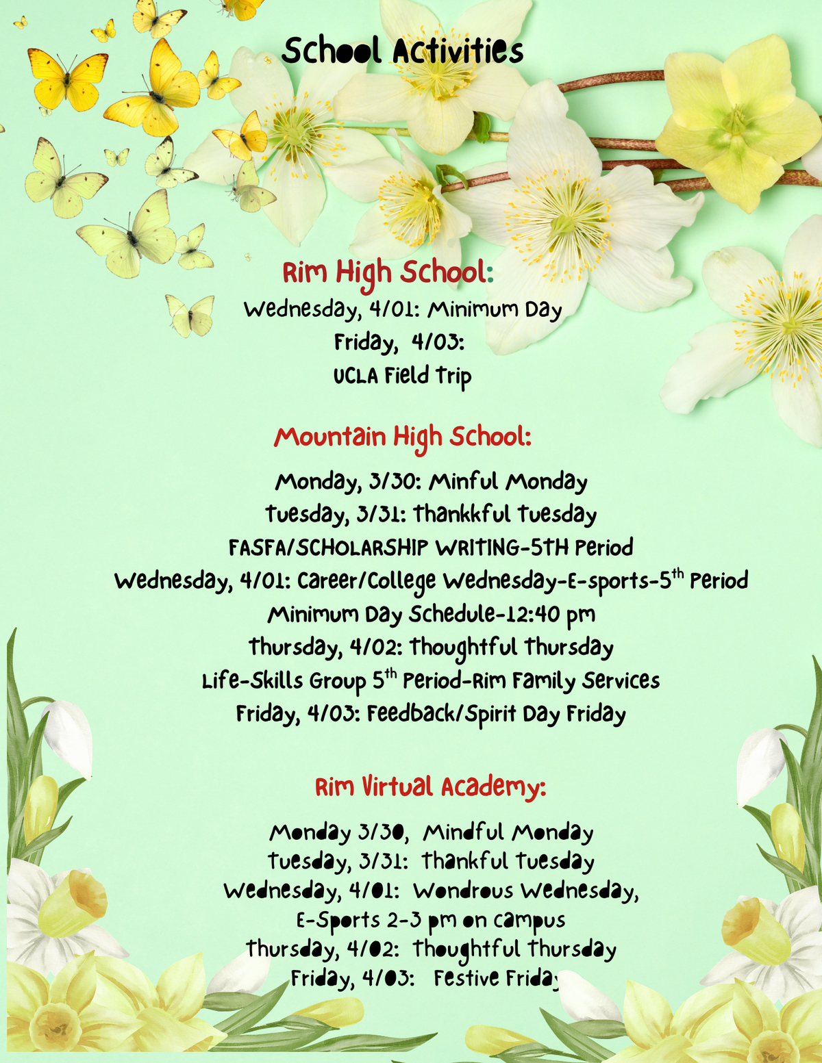 Page: School Activities 3: RHS-Wednesday, 4/01: Minimum Day, Friday, 4/03: UCLA Field Trip.