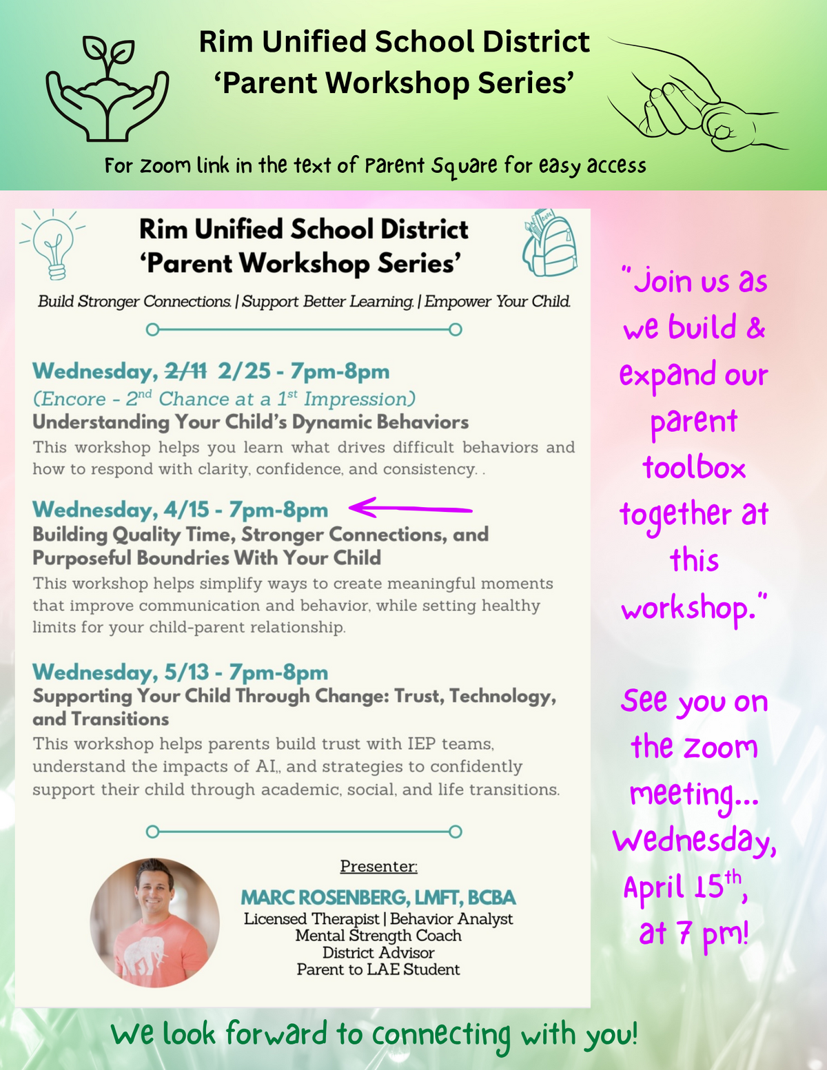 Page: Special Education “Parent Workshop Series” RIM Unified School District "Parent Workshop Series". Build Stronger Connections/Support Better Learning/Empower Your Child. Wednesday, 2/25 from 7 pm to 8 pm. (Encore 2 Chance at 1st Impression). Understanding Your Child's Dynamic Behaviors: This workshop helps you learn what drives difficult behaviors and how to respond with clarity, confidence, and consistency. Wednesday, 4/15, 2026, from 7 pm to 8 pm. Building Quality Time, Stronger Connections, and Purposeful Boundaries With Your Child: This workshop helps simplify ways to create meaningful moments that improve communication and behavior, while setting healthy limits for your child-parent relationship.Wednesday, 5/13, 2026, from 7 pm to 8 pm. Supporting Your Child Through Change: Trust, Technology, and Transitions: This workshop helps parents build trust with IEP teams, understand the impacts of AI, and strategies to confidently support their child through academic, social, and life transitions. Presenter: Marc Rosenberg, LMFT, BCBA, Licensed Therapist/Behavior Analyst, Mental Strength Coach, District Advisor, Parent to LAE Student.
