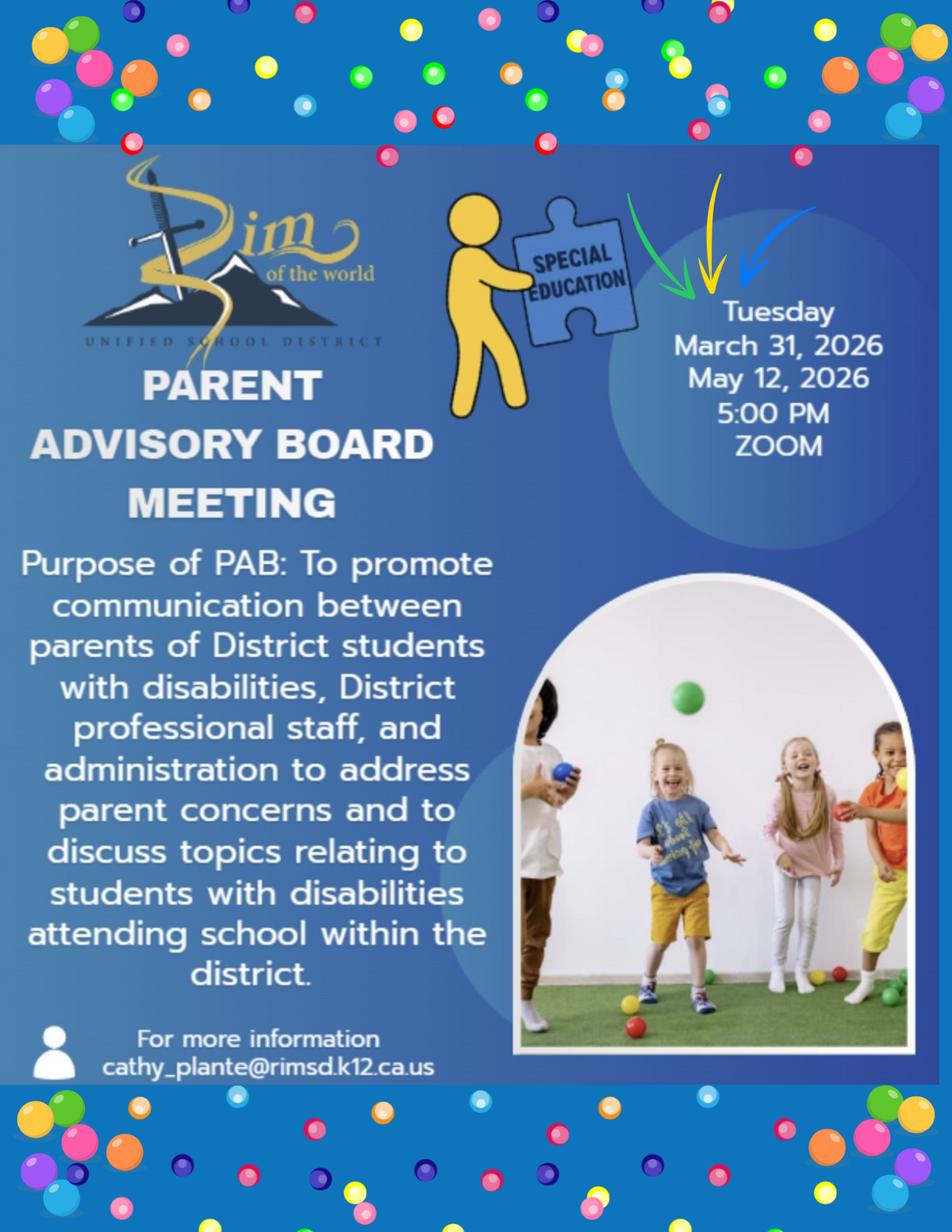 Page: Parent Advisory Board Meeting on Tuesday, March 31st and May 12th at 5 pm on Zoom. Purpose of PAB Meeting: To promote communication between parents of District students with disabilities, District professional staff, and administration to address parent concerns and to discuss topics relating to students with disabilities attending school within the district. For more information: cathy_plante@rimsd.k12.ca.us