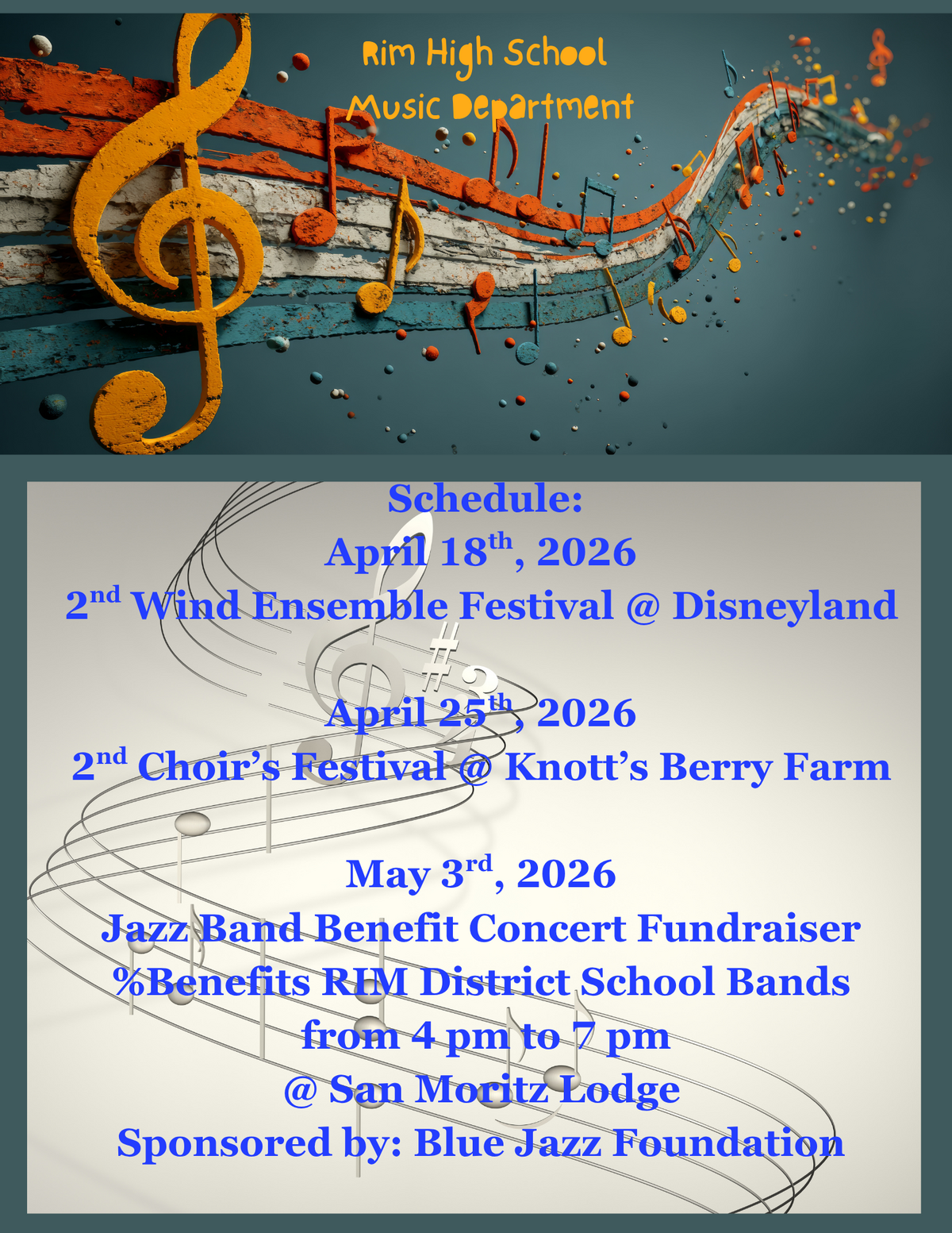 Page: Rim High School Music Department: Schedule: April 18th, 20262nd Wind Ensemble Festival @ Disneyland, April 25th, 2026 2nd Choir’s Festival @ Knott’s Berry Farm, May 3rd, 2026 Jazz Band Benefit Concert Fundraiser %Benefits RIM District School Bands from 4 pm to 7 pm@ San Moritz Lodge. Sponsored by: Blue Jazz Foundation.