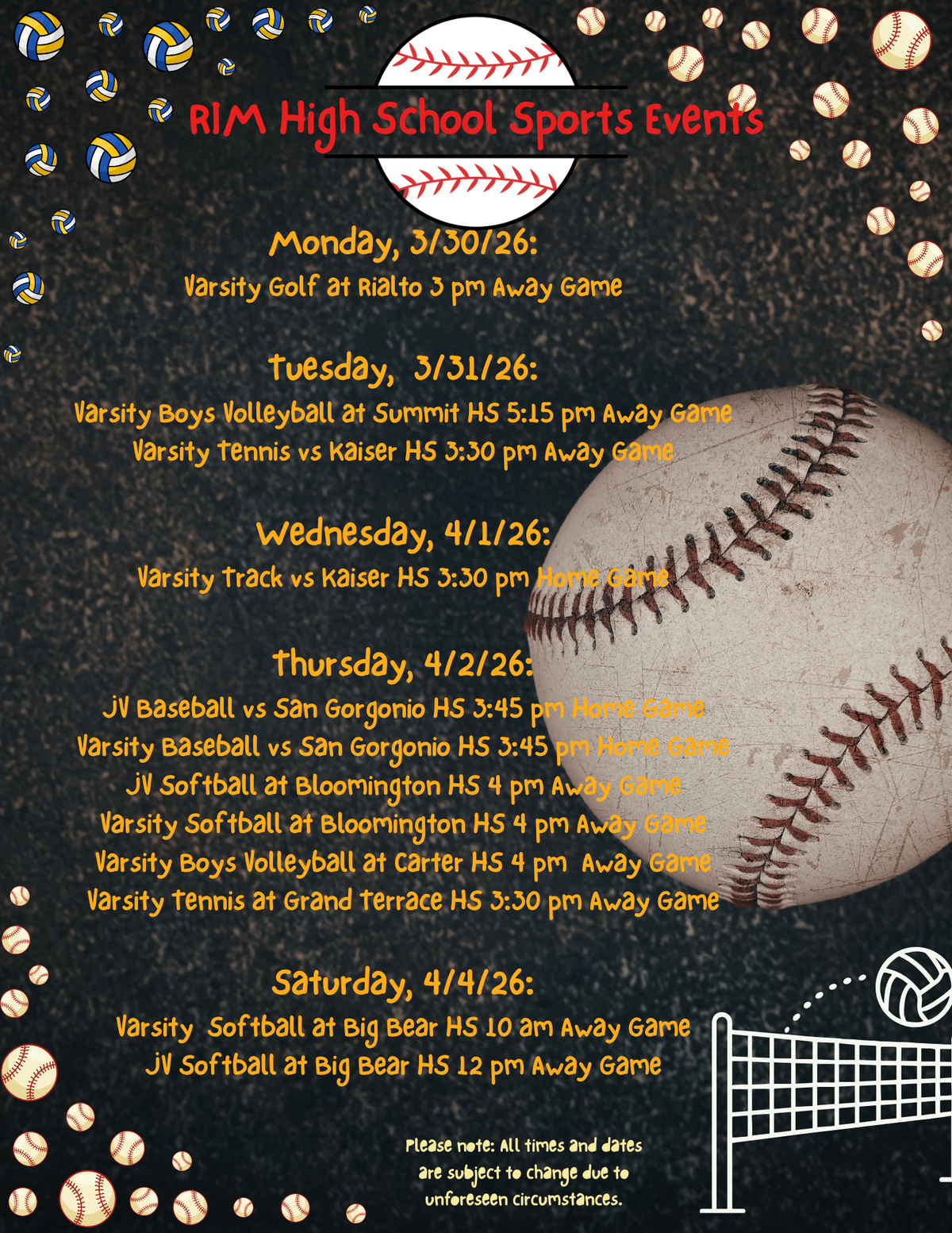 Page: RIM High School Sports Events. Monday, 3/30/26: Varsity Golf at Rialto 3 pm Away Game, Tuesday, 3/31/26:, Varsity Boys Volleyball at Summit HS 5:15 pm Away Game, Varsity Tennis vs Kaiser HS 3:30 pm Away Game, Wednesday, 4/1/26:, Varsity Track vs Kaiser HS 3:30 pm Home Game, Thursday, 4/2/26: