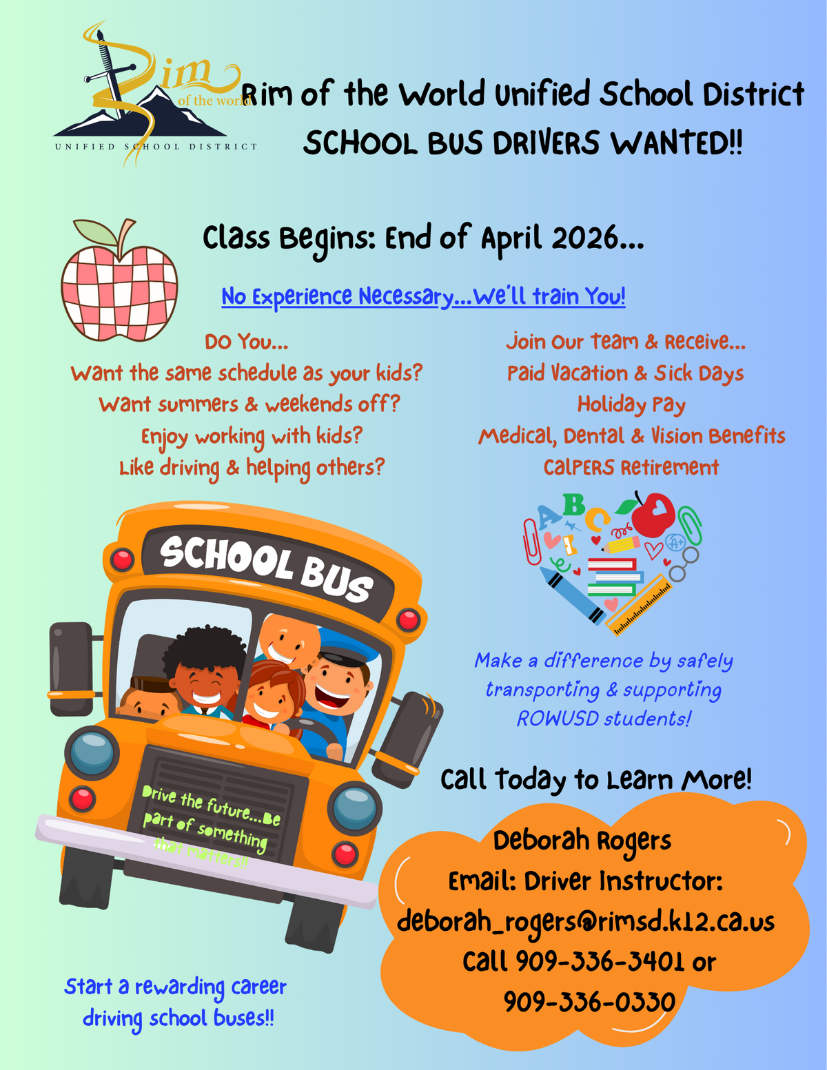 Page: Rim of the World Unified School District SCHOOL BUS DRIVERS WANTED!! Class Begins: End of April 2026...No Experience Necessary...We’ll train You!