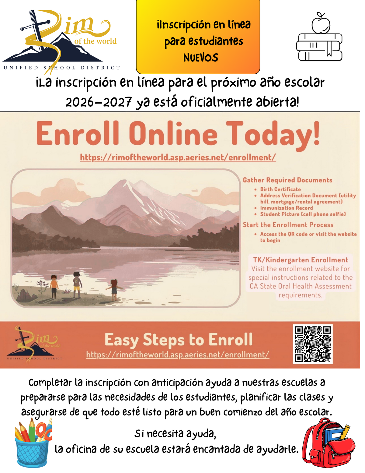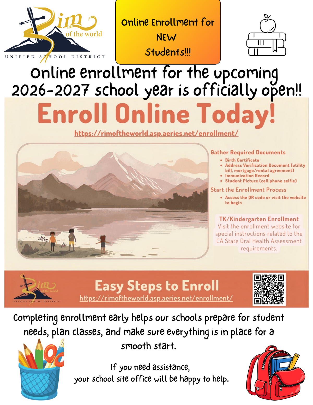TK/Kindergarten Enrollment-Visit the enrollment website for special instructions related to the CA State Oral Health Assessment requirements. Easy steps to enroll: https://rimoftheworld.asp.aeries.net/enrollment/