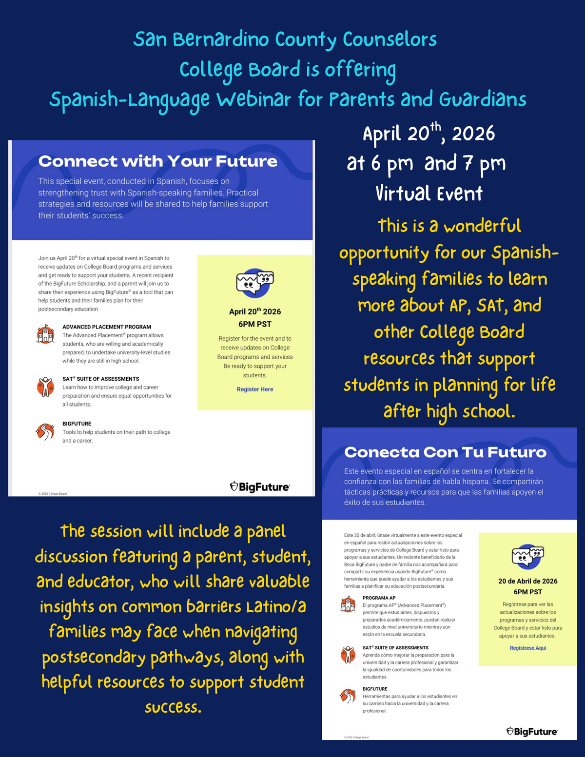 Page: San Bernardino County Counselors College Board is offering a Spanish-Language Webinar for Parents and Guardians. April 20th, 2026