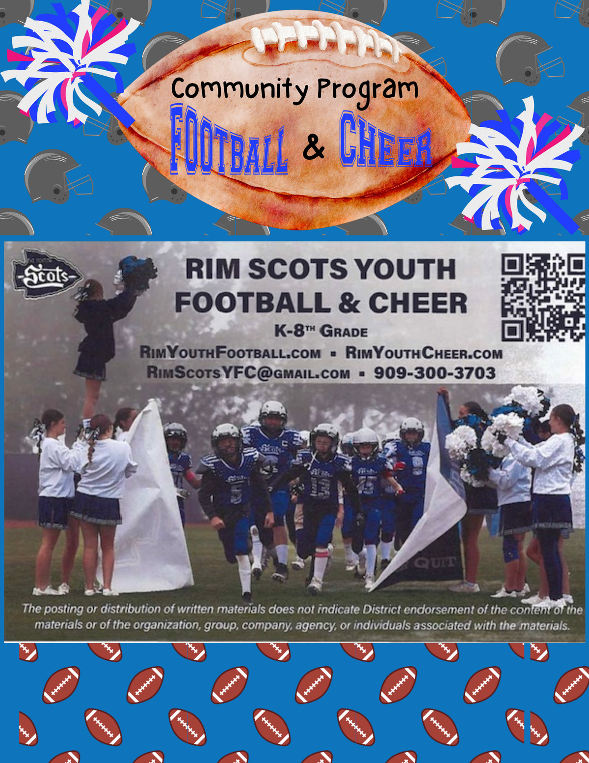 Page: Community Program: Football & Cheer: RIM Scots Youth & Football Cheer K-8th Grade. RIMYouthFootball.com / RimYouthCheer.com / RimScotsYFC@gmail.com / 909-300-3703 Per ROWUSD School District: this posting, distribution, or written materials does not indicate district endorsement of the content of the materials or ot the organization, group, company, agency, or individuals associated with the materials.
