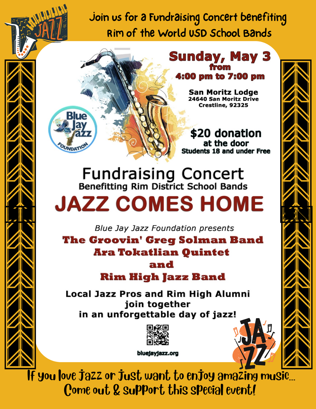 Page: Join us for a Fundraising Concert benefiting Rim of the World USD School Bands: Sunday, May 3rd, 2026, from 4 pm to 7 pm. Located at San Moritz Lodge 24646 San Moritz Drive, Crestline, CA 92325. $20 donation at the door. Students under 18 and under are FREE. Fundraising Concert Benefitting Rim District School Bands Jazz Comes Home. Blue Jay Jazz Foundation Presents The Groovin' Greg Solman Band, Ara Tokatlian Quintet, and Rim High Jazz Band. Local Jazz Pros and Rim High Alumni join together in an unforgettable day of jazz. If you love jazz or just want to enjoy amazing music...Come out & support this special event!