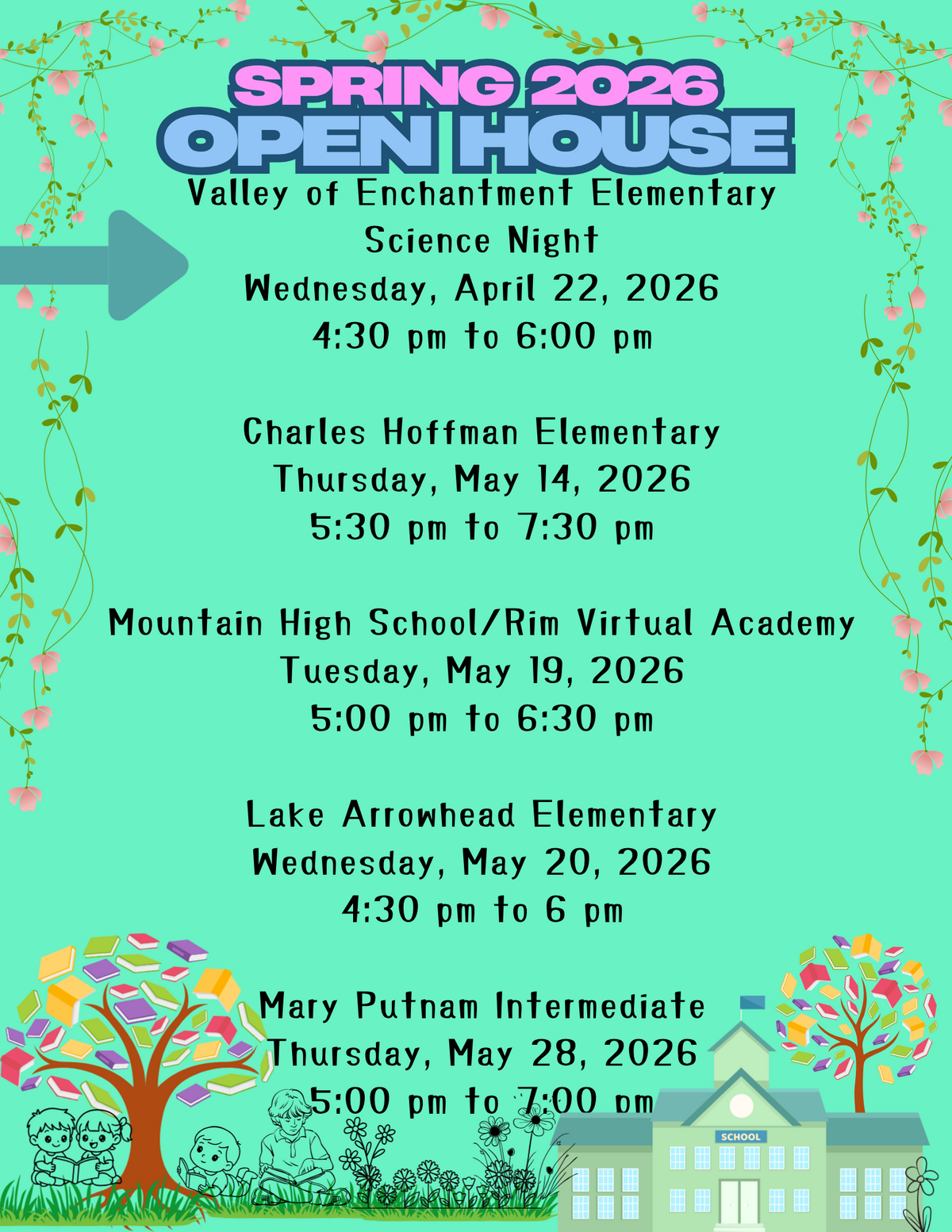 Spring Break. April Saturday Academy, Dates to be announced. April 16th, 2026: School Board Meeting. April 22nd, 2026: 4:30 pm to 6:00 pm