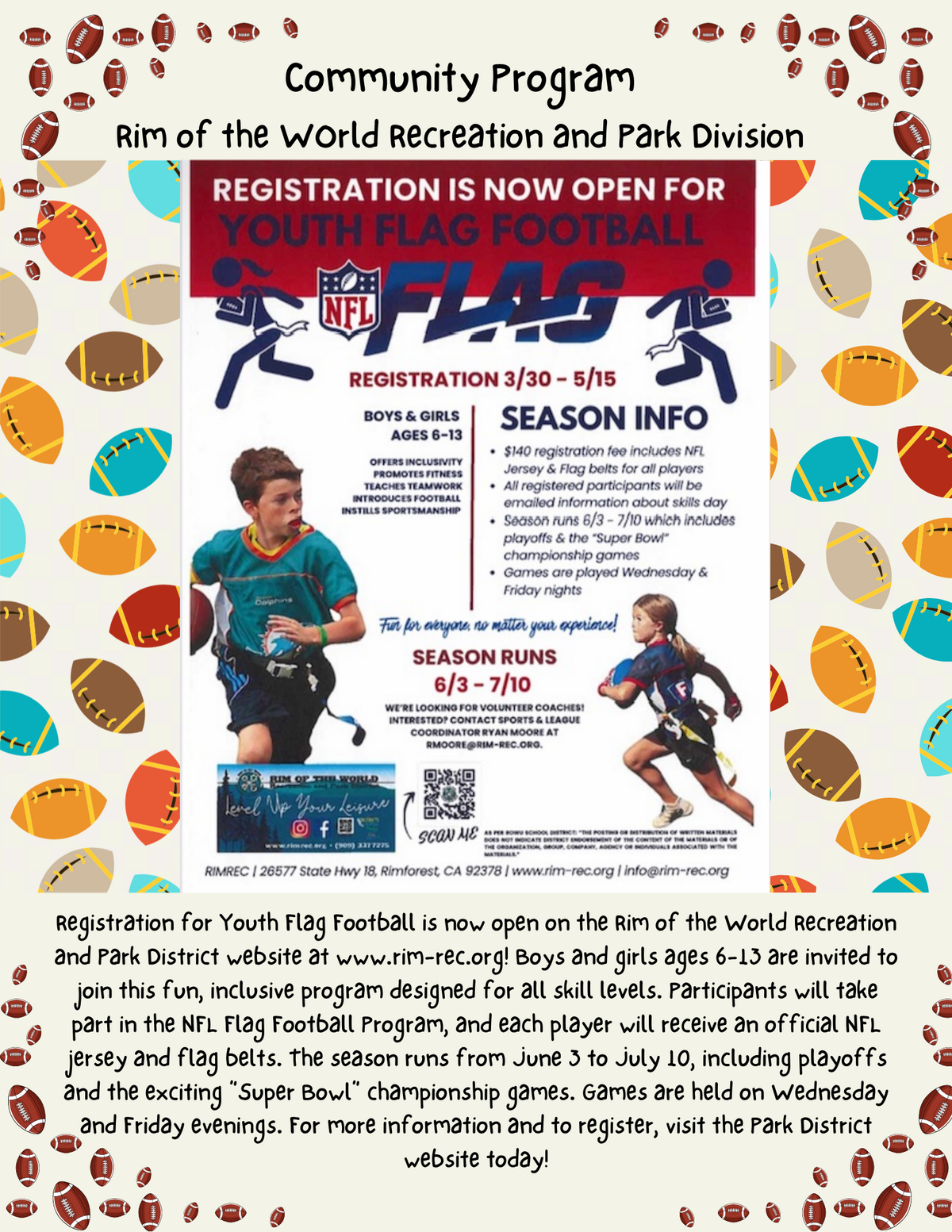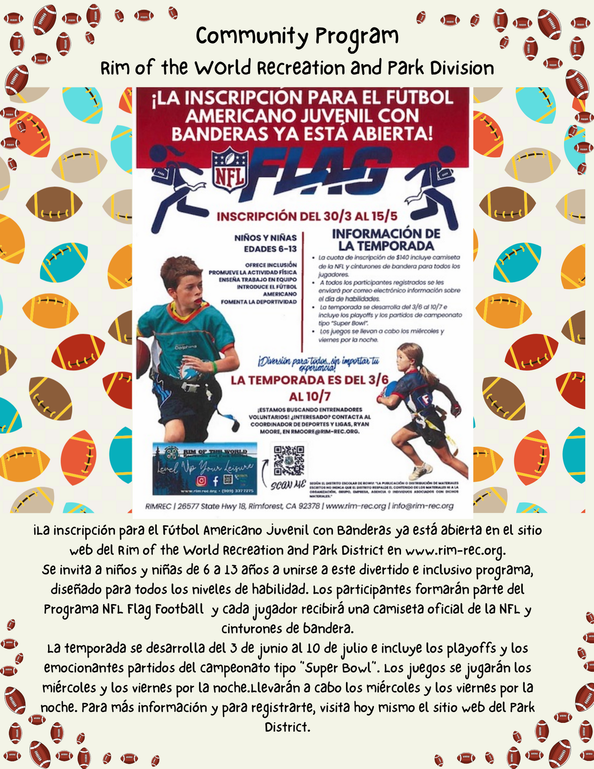 Page: Community Program Rim of the World Recreation and Park Division. ¡La inscripción para el Fútbol Americano Juvenil con Banderas ya está abierta en el sitio web del Rim of the World Recreation and Park District en www.rim-rec.org. Se invita a niños y niñas de 6 a 13 años a unirse a este divertido e inclusivo programa, diseñado para todos los niveles de habilidad. Los participantes formarán parte del Programa NFL Flag Football y cada jugador recibirá una camiseta oficial de la NFL y cinturones de bandera. La temporada se desarrolla del 3 de junio al 10 de julio e incluye los playoffs y los emocionantes partidos del campeonato tipo “Super Bowl”. Los juegos se jugarán los miércoles y los viernes por la noche.Llevarán a cabo los miércoles y los viernes por la noche. Para más información y registrarte, visita hoy mismo el sitio web del Park District. ¡La inscripción para el Fútbol Americano de Bandera Juvenil (Youth Flag Football) ya está abierta en el sitio web del Rim of the World Recreation and Park District en www.rim-rec.org!