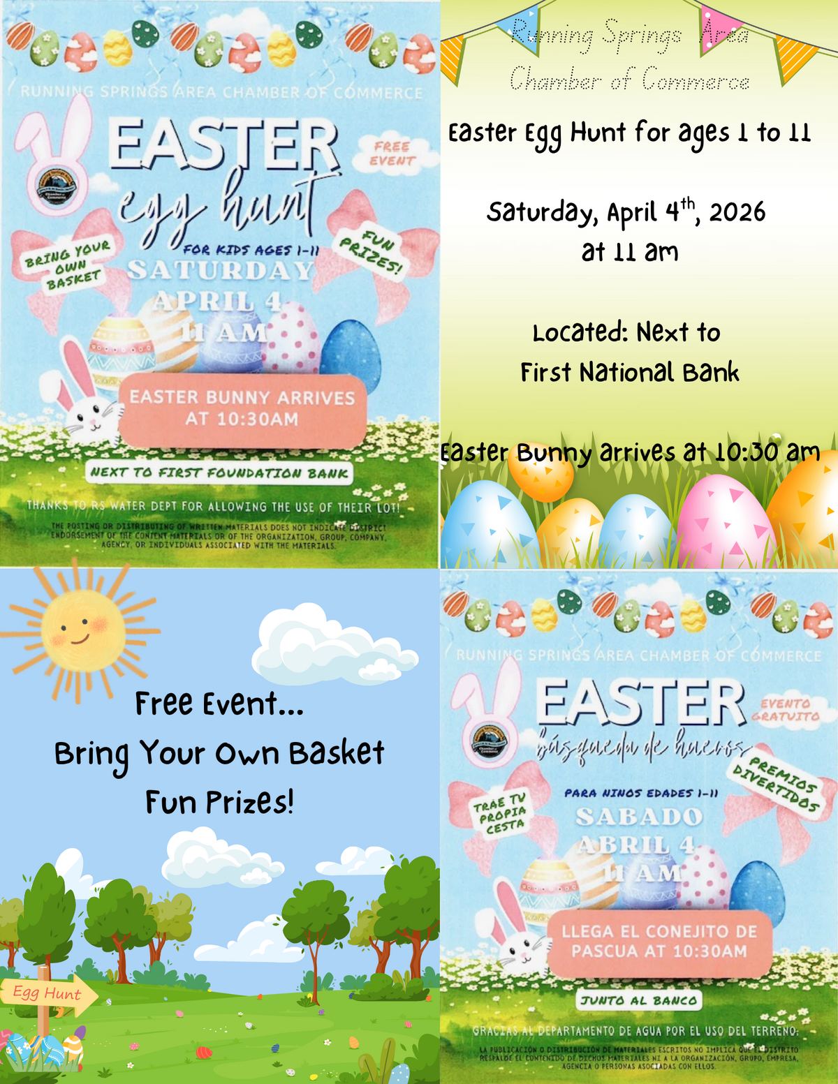 Page: Running Springs Area Chamber of Commerce: Easter Egg Hunt for ages 1 to 11, Saturday, April 4th, 2026, at 11 am. Located: Next to First National Bank