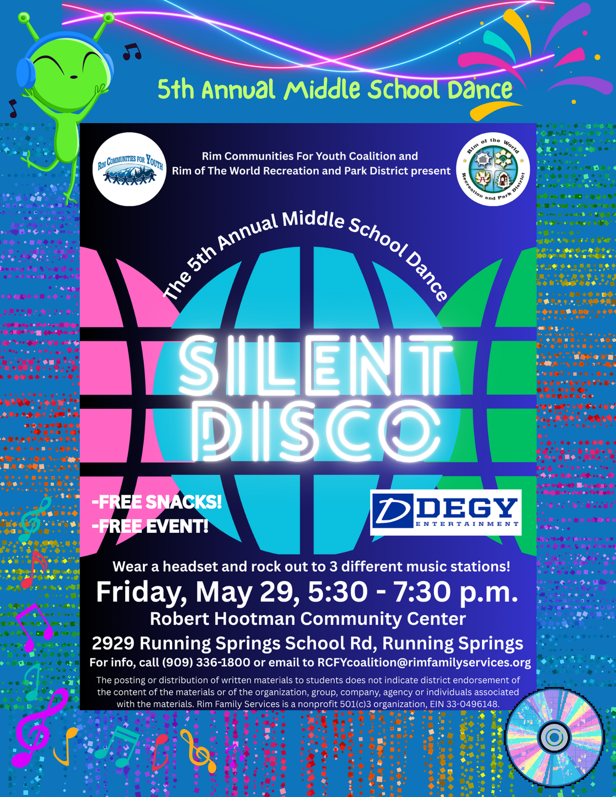 Page: 5th Annual Middle School Dance Rim Communities for Youth Coalition and Rim of the World Recreation and Park District present: The 5th Annual Middle School Dance-Silent Disco. Free Snacks and a Free Event. Presented by DEGY Entertainment. Wear a headset and rock out to 3 different music stations! Friday, May 29th, 5:30 to 7:30 pm. Robert Hootman Community Center. Location: 2929 Running Springs School Rd, Running Springs. For info, call (909) 336-1800 or email to RCFYcoalition@rimfamilyservices.org