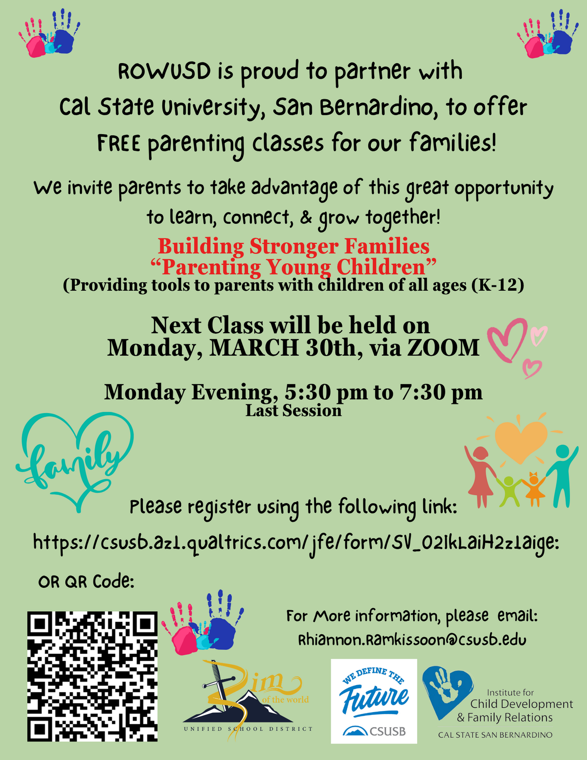 Page: ROWUSD is proud to partner with Cal State University, San Bernardino, to offer FREE parenting classes for our families! We invite parents to take advantage of this great opportunity to learn, connect, & grow together! Building Stronger Families “Parenting Young Children” (Providing tools to parents with children of all ages (K-12) Next Class will be held on Monday, MARCH 30th, via ZOOM, Monday Evening, 5:30 pm to 7:30 pm. Last Session.