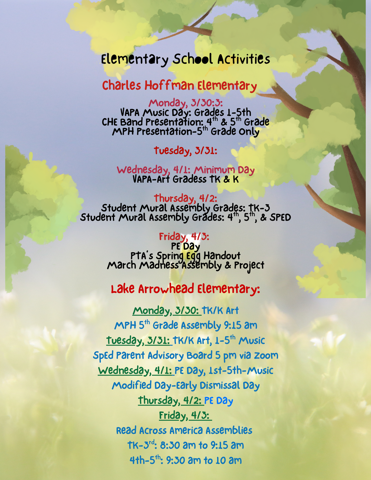 Lake Arrowhead Elementary: Monday, 3/30: TK/K Art, MPH 5th Grade Assembly 9:15 am, Tuesday, 3/31: TK/K Art, 1-5th Music, SpEd Parent Advisory Board 5 pm via Zoom, Wednesday, 4/1: PE Day, 1st-5th-Music Modified Day-Early Dismissal Day, Thursday, 4/2: PE Day, Friday, 4/3: Read Across America Assemblies TK-3rd: 8:30 am to 9:15 am, 4th-5th: 9:30 am to 10 am.