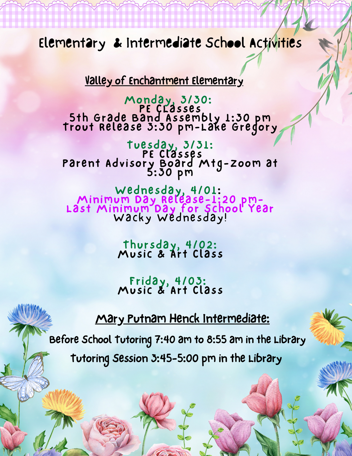 Page: School Activities 2: Elementary & Intermediate School Activities. Valley of Enchantment Elementary-Monday, 3/30: